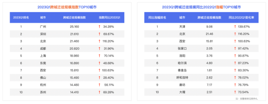 人口流動與交通的發展密不可分。同比2022第一季度,2023第一季度百城跨城遷徙規模指數都增,平均漲幅達到47.64%。最高漲幅城市為天津,漲幅達139.67%;北京、?安以漲幅116.20%、100.63%位居漲幅榜第二、第三。