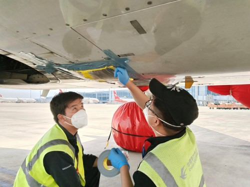 由于溫度較高,機務人員細心地檢查封存膠帶的粘性,避免由于高溫軟化或脫膠,以及對飛機表面產生腐蝕。雖然在機腹陰涼處,兩位機務小伙還是感覺層層熱浪
