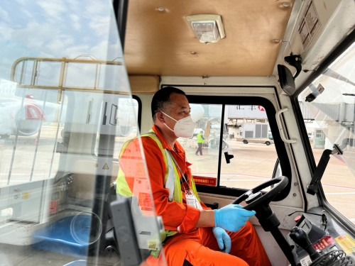 MU6328航班到達行李運送中,開窗通風才能讓小小的行李牽引車車內溫度降低點。