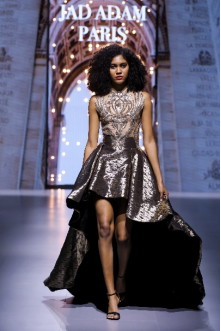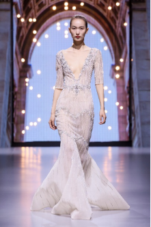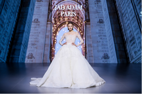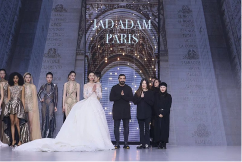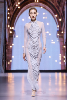 在充滿異域風情的“巴爾米拉女王”主題發(fā)布中,法國高定女裝設計師JadAdam攜手紹興永耀紡織品有限公司、紹興晶遠創(chuàng)意設計有限公司展現(xiàn)了尋找內(nèi)心平靜的啟蒙之旅的獨特過程。設計師從柯橋優(yōu)秀的面料中獲得啟發(fā),在華麗的禮服裙中采用了大量的刺繡及繡片繡珠工藝。兩家企業(yè)提供的閃光高密度歐根紗、銀色金屬絲、清透網(wǎng)眼等面料,花型立體簡潔、色彩透亮多變,為設計師帶來了豐富的靈感。從晚禮服、婚紗到高級時裝,JadAdam通過特有的藝術表現(xiàn)手法詮釋了本次禮服設計。