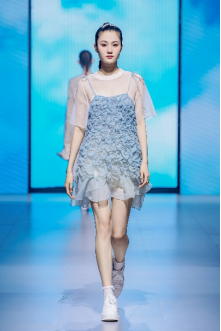 在“童年”主題秀演中,法國設計師聯(lián)袂浙江懿紗紡織科技有限公司、紹興柯橋豐旺紡織品有限公司,圍繞兒童的藝術、回到學校、童年的回憶三個子主題,共同演繹了童年的懷舊故事。設計師以精細的絎縫、印染、明線縫紉及自然著色的效果制作服裝和圖案,在工藝上采用了法國特有的編織技術,并結合WALTZ系列花紗、三醋酸、錦滌歐根紗、六角硬網(wǎng)等面料輕薄有型、色彩飽滿的特色,最大程度實現(xiàn)了紡織工藝的價值化。特別是在傳統(tǒng)手工藝非遺、生態(tài)環(huán)保材料等系列元素的加持下,為整場秀演增添了可持續(xù)時尚的價值。