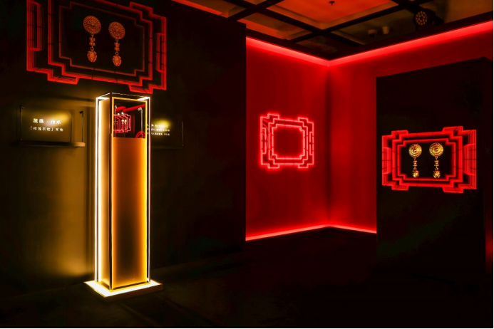 博大精深的中國傳統文化孕育出無限創造力和想象力,因此周大福珠寶集團在探索珠寶美學與中國傳統文化相結合的過程中不斷推陳出新,呈獻許多匠心獨運的藝術臻品——標志性的周大福傳承系列作品。此次GOLD IS CHIC鎏光時代·周大福傳承系列黃金美學藝術展跨越時空界限,將蘊含歷史、文化的黃金美學呈現到大眾視野中,全方面展現黃金珠寶設計背后的時尚創意靈感、精益求精的工藝和具有東方韻味的藝術美學理念。此次展覽的空間設計從周大福傳承系列視覺大片中汲取靈感,衍生出紅黑金三色、光影不斷變換、又極富想象力的三個空間,以創新的藝術視角展現品牌具有中國傳統文化內涵的時尚潮流形象。置身于展覽空間,映入眼簾的是霓虹線條與迷離燈光相互交織而成的“時光隧道”,使人仿佛置身于過去與未來的交界地。光影流動的變幻間,映照出品牌歷經歲月沉淀后的璀璨輝煌,這意味著品牌正開啟黃金世代的嶄新篇章。