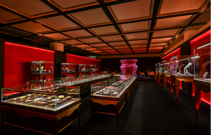 其中,盛世華彩·傳承系列的唐馬套系,以現藏于陜西歷史博物館的唐三彩馬三花馬為原型,采用傳統黃金鑄造、花絲、 鏨刻魚子地等工藝的基礎上,加之藝術加工與文化創意,再現大唐盛世開放融合的生活之態;從古至今,葫蘆文化有著數千年的歷史積淀,以其獨特的歷史淵源在現代文化中占據重要地位,是中華吉祥文化的代表象征。展柜中陳列著各式各樣的葫蘆作品,不僅僅造型上精心雕琢、美輪美奐,工藝上采用黃金花絲、琺瑯、鏨刻等多重工藝表達傳統文化的美,也將富貴長壽、福祿雙全的吉祥祝福寄托于物;“洛陽親友如相問,一片冰心在玉壺”,品牌借由國玉·傳承系列的玉承萬代和田玉茶具表達出牽絆著遠行人的心緒,將品牌對生活美學的研究和融入發揮至極致。