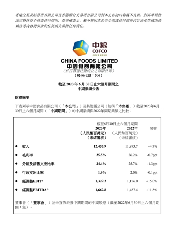 展望未來,中國食品表示,隨著各類積極政策信號不斷釋放,經濟持續回升向好、消費復蘇,以及高質量發展的趨勢更加顯著,公司對2023全年收入及利潤實現穩健增長仍然充滿信心,公司將持續積極推動產品結構升級、業務組合優化、供應鏈整合等重點戰略,促進預期業績保持平穩發展。